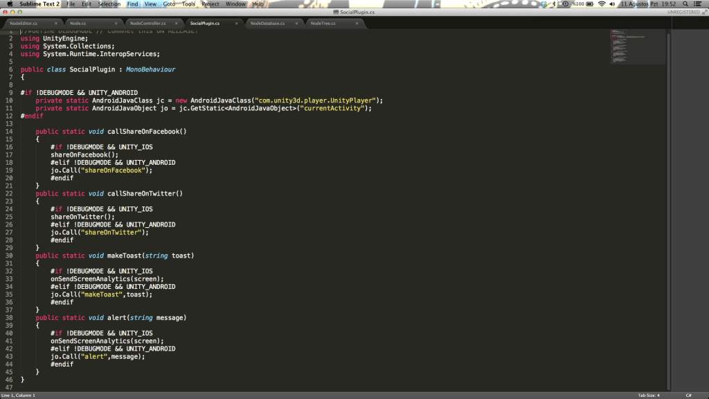Let’ s begin, like I said before you can do much more than logging to DDMS by overriding “UnityPlayerActivity”. Making a toast for your android game is really simple we will just add a simple “makeToast” method to our MainActivity class on Java side and also within Unity3D. Go ahead and download project files from github. I tried to explain the details shortly with Readme file inside repository. Repository has two projects; One is Unity3d project and the other one is Eclipse projects(our plugin). Just clone the repository and take a look at the scripts. Besides making toast I added facebook and twitter share methods and also an alert view method, just take a look at the Test.cs script inside Unity project. Be sure to check Androidmanifest.xml (we are overriding unity’s current activity!).