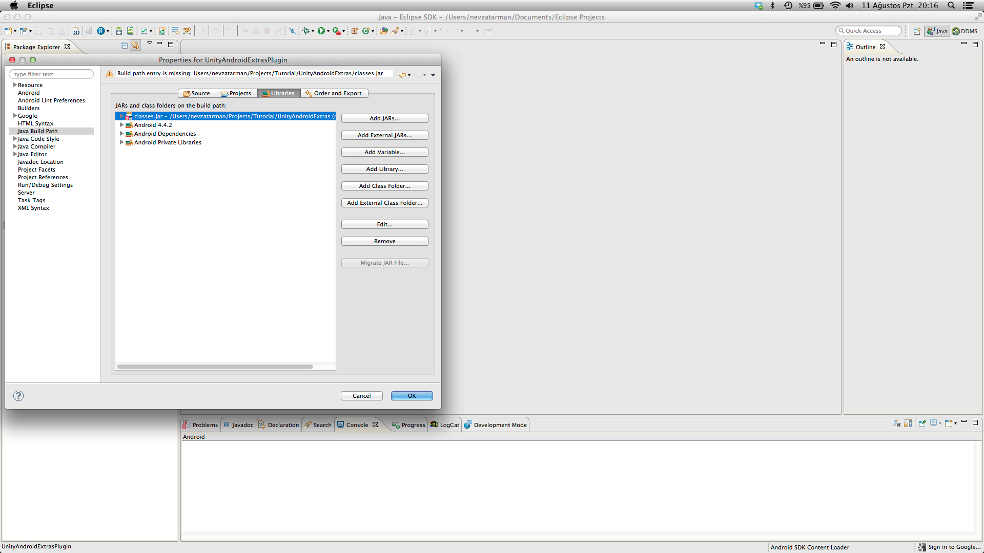 - Import unity generated eclipse project into Eclipse and open Android tab from it’s properties. From libraries section add UnityEclipsePlugin as Library.(image3).