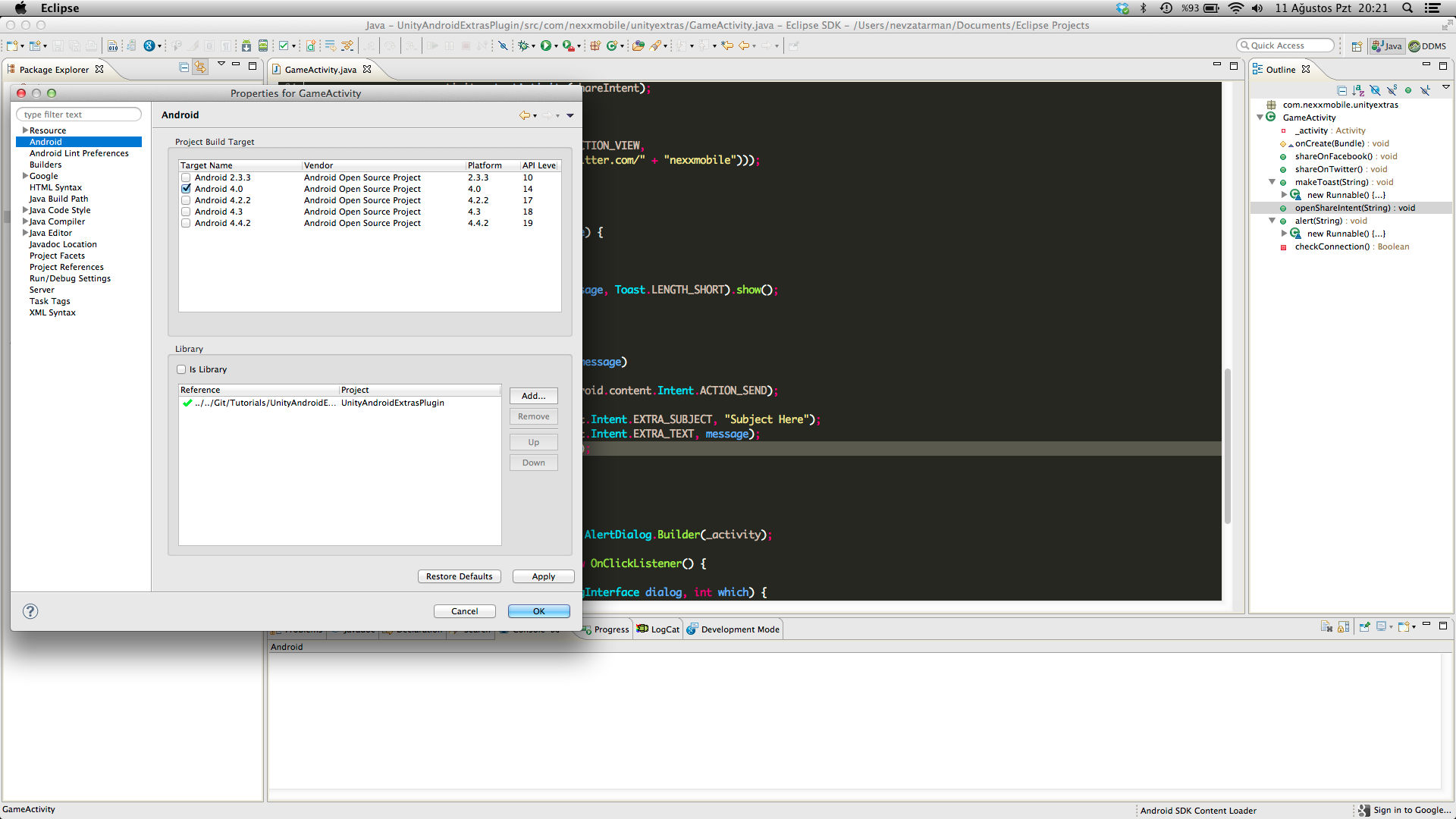 - Import unity generated eclipse project into Eclipse and open Android tab from it’s properties. From libraries section add UnityEclipsePlugin as Library. And run your project thats it.