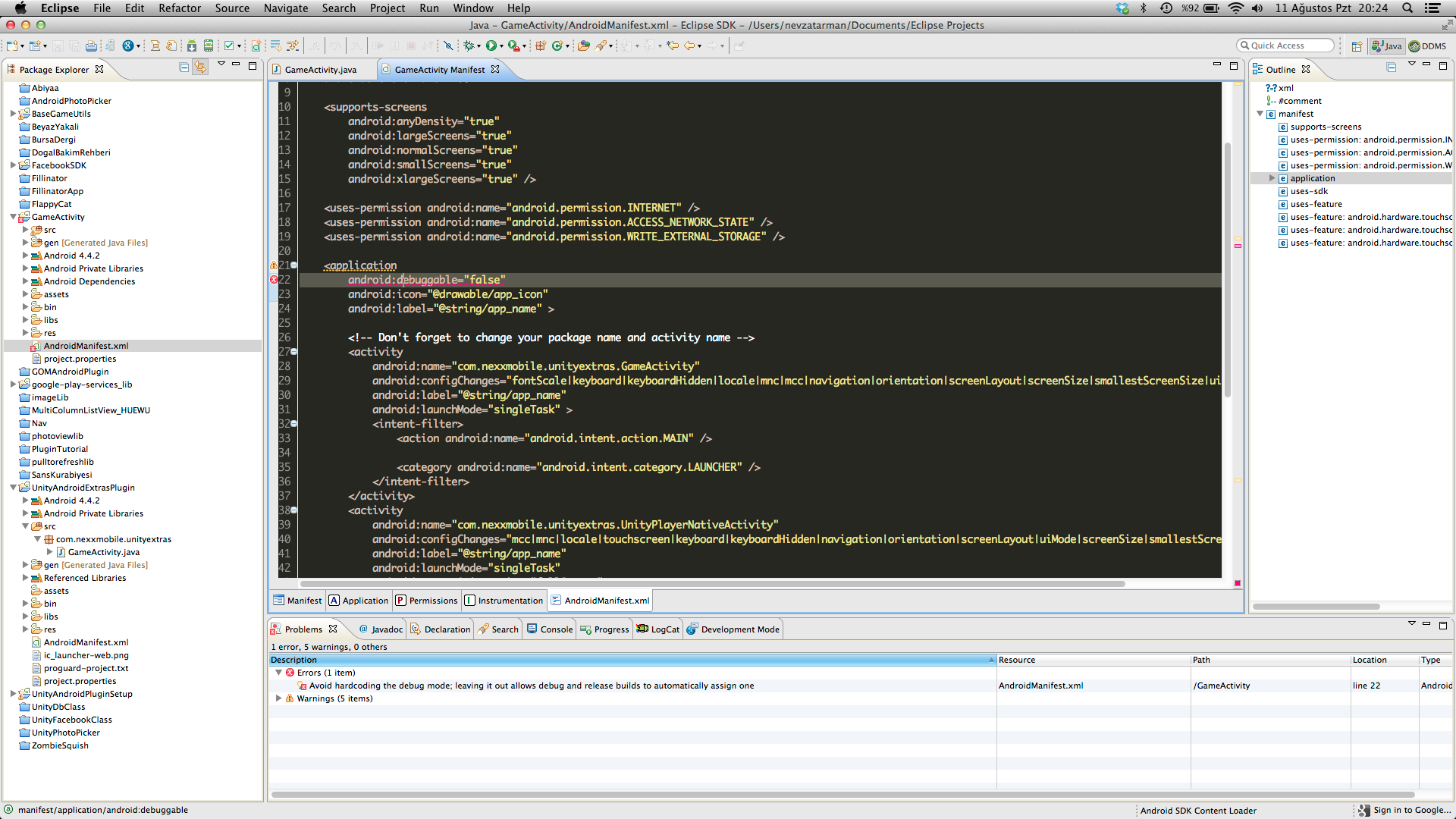 PS: After importing unity eclipse project eclipse will give you a warning inside Androidmanifest.xml (see image below). You need to delete that line!