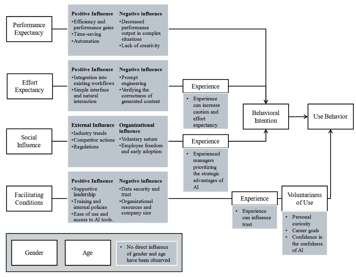 UTAUT framework. Positive factors, such as perceived efficiency gains, user-friendliness, and