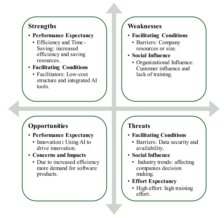 As I showcased in my previous post, the findings of my research can serve as a foundation for further analysis. These insights can support strategic positioning and decision-making. For instance, as seen in Figure 1. a SWOT analysis can help companies identify strengths, such as increased efficiency and the benefits of integrated AI tools. Recognizing weaknesses, like resource limitations or inadequate training, highlights areas that require investment in infrastructure and skill development.